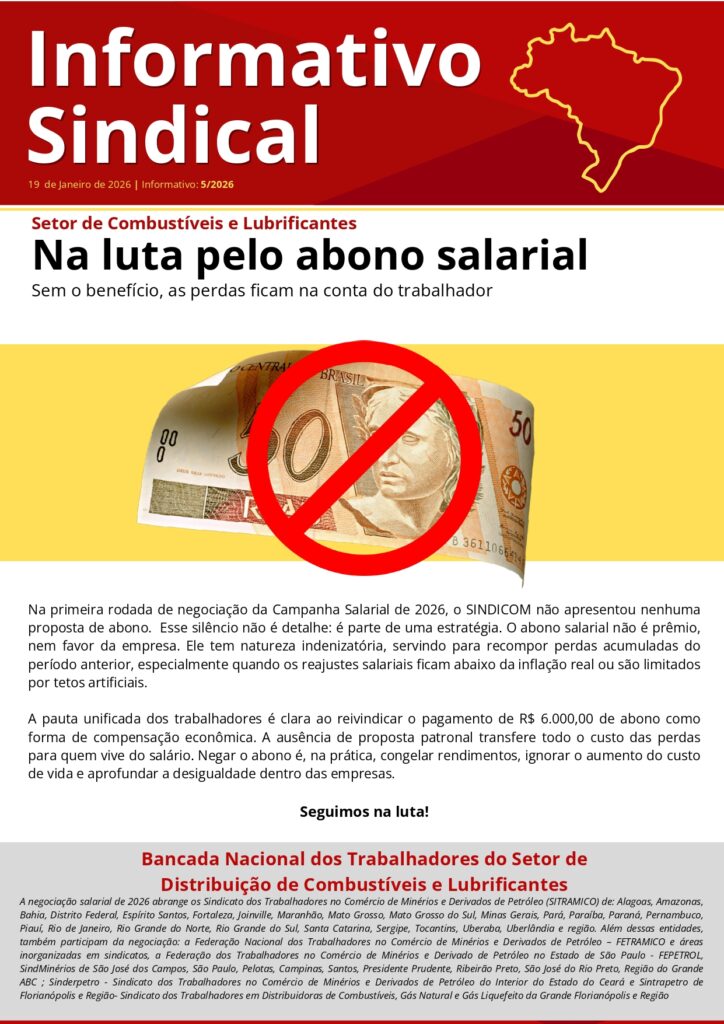 Na 1ª rodada da negociação coletiva com o Sindicom (sindicato que representa as empresas distribuidoras de Combustíveis e Lubrificantes), no dia 14/01, não foi apresentada proposta para o Abono Salarial embora seja um dos itens da nossa Pauta de Reivindicações Unificada. Leia o Informativo Sindical conjunto sobre um dos temas mais importantes da nossa pauta – ABONO SALARIAL.